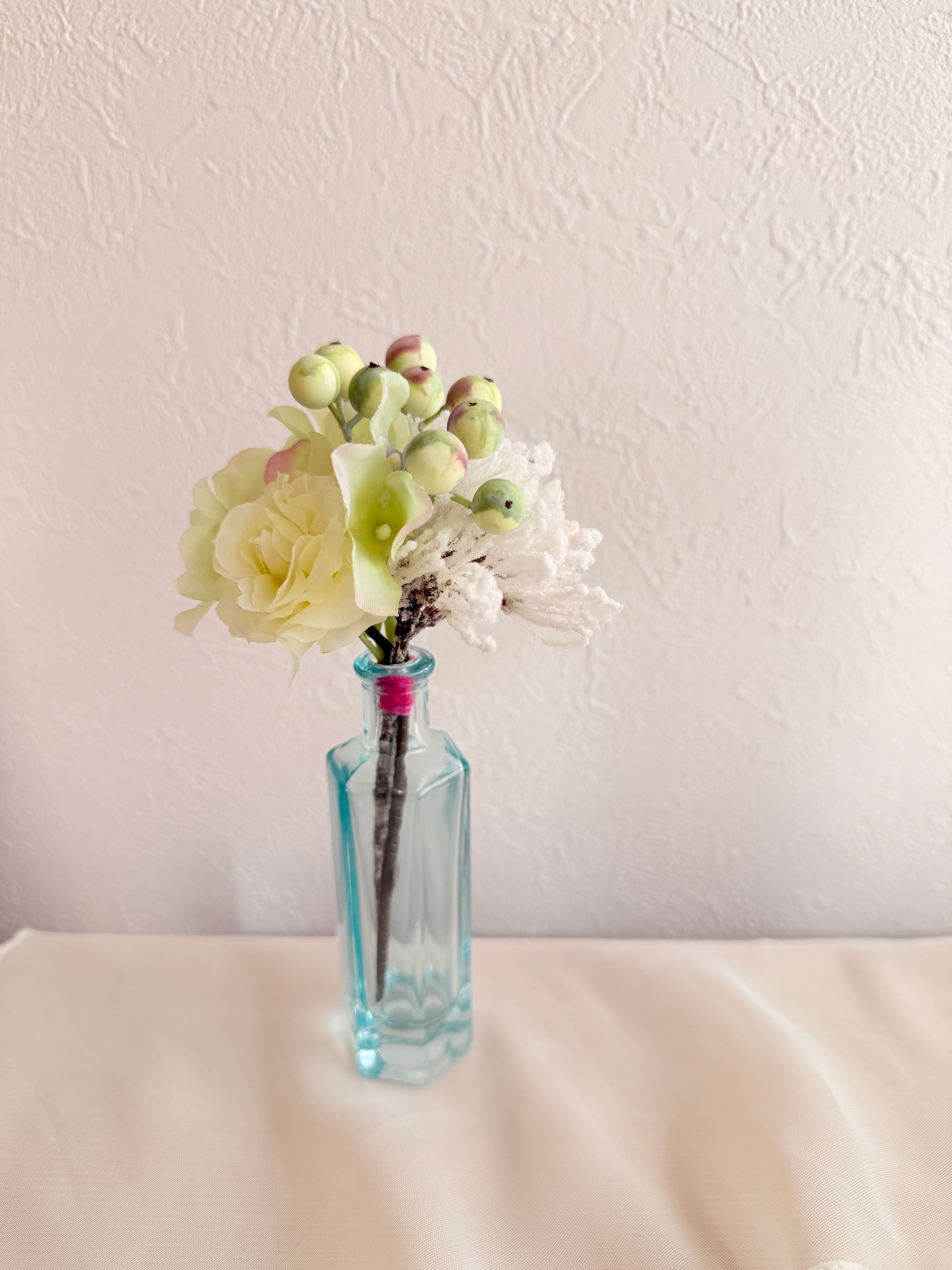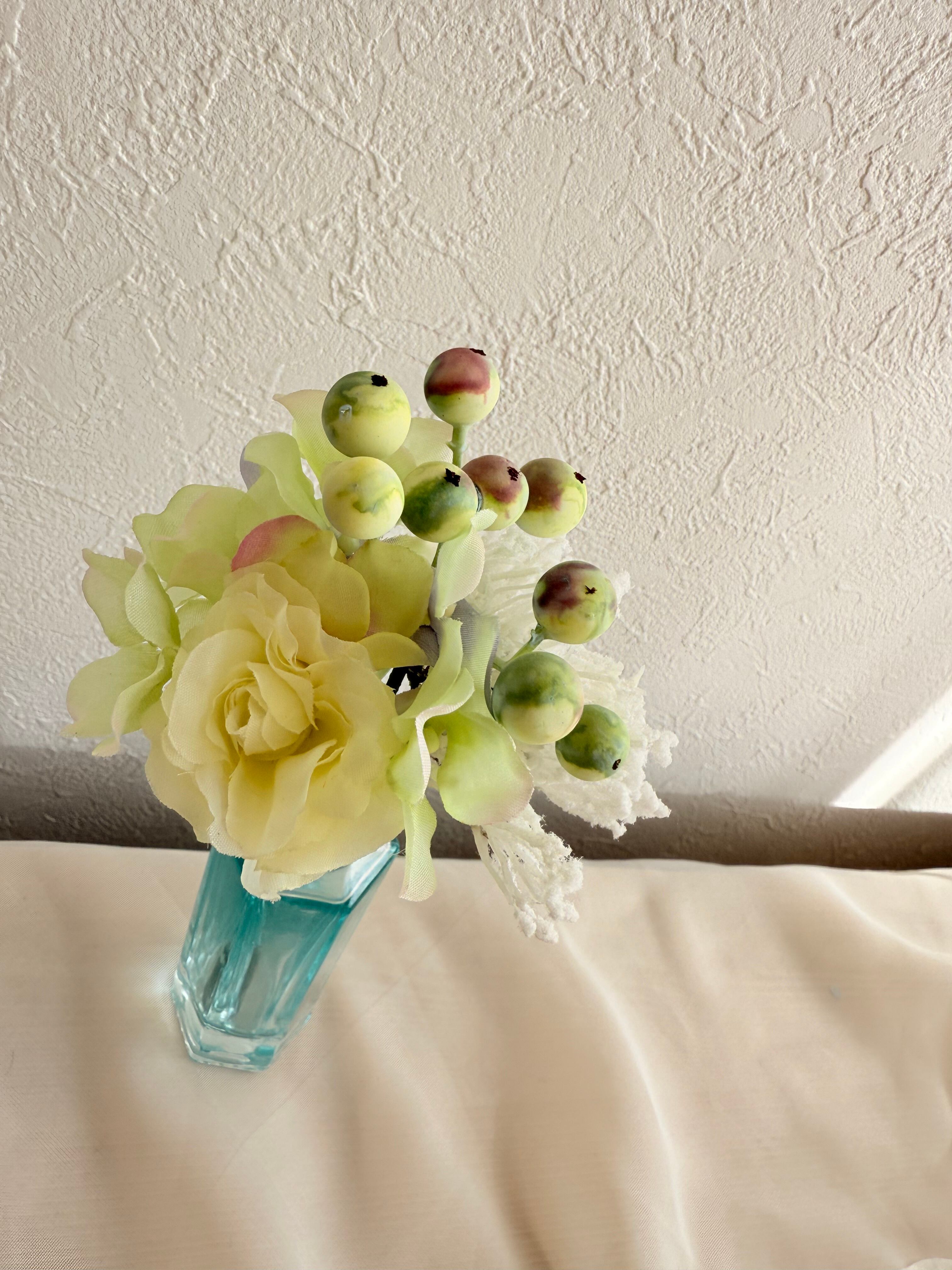 アーティフィシャルフラワーと小瓶をを使用しています。